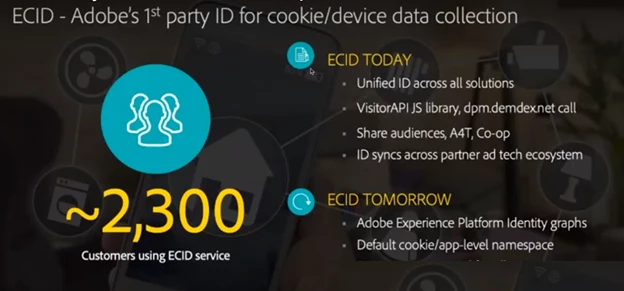 Adobe was a pioneer in the use of ECID data to develop customer profiles. To date, Adobe has about 2,300 customers using our ECID service. Now, with the integration of Identity Service into Adobe Experience Platform, we are able to unify the collection of cookie and device data from all Adobe solutions providing our customers the ability to sync their various types of identity data across all the platform services and Adobe solutions they use.