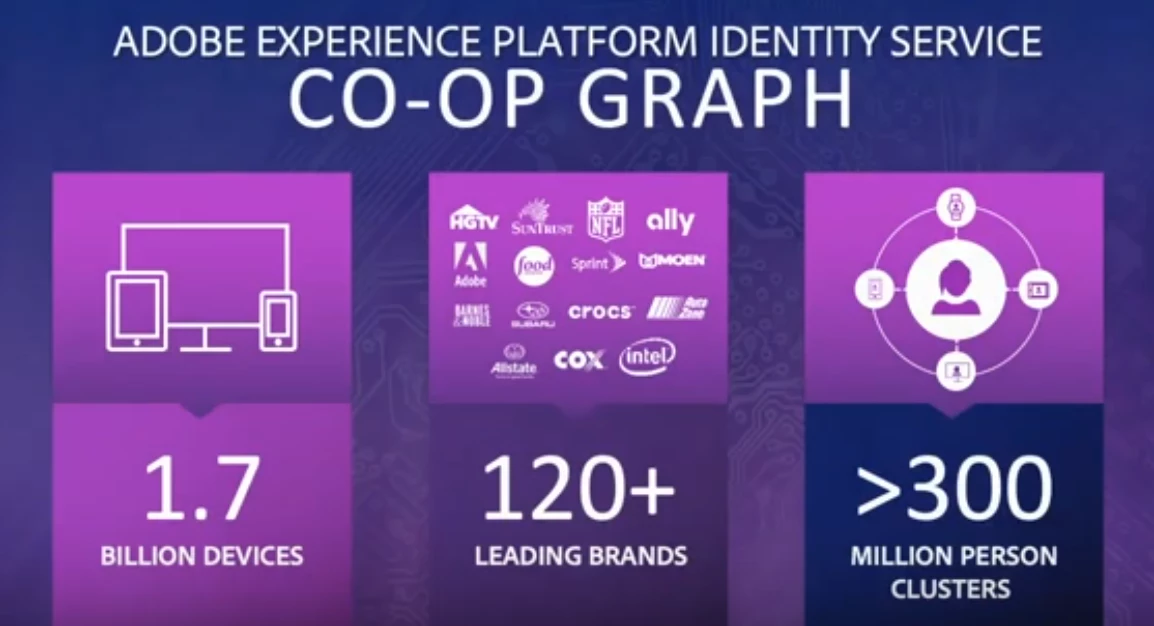 When Adobe began developing Identity Service, it started with the Co-op Graph. Over the past three years, it has become one of the richest shared data sets available on the market for the development of customer identities with more than 120 leading brands contributing data, 1.7 billion devices identified and 300 million person clusters in the US and Canada alone.