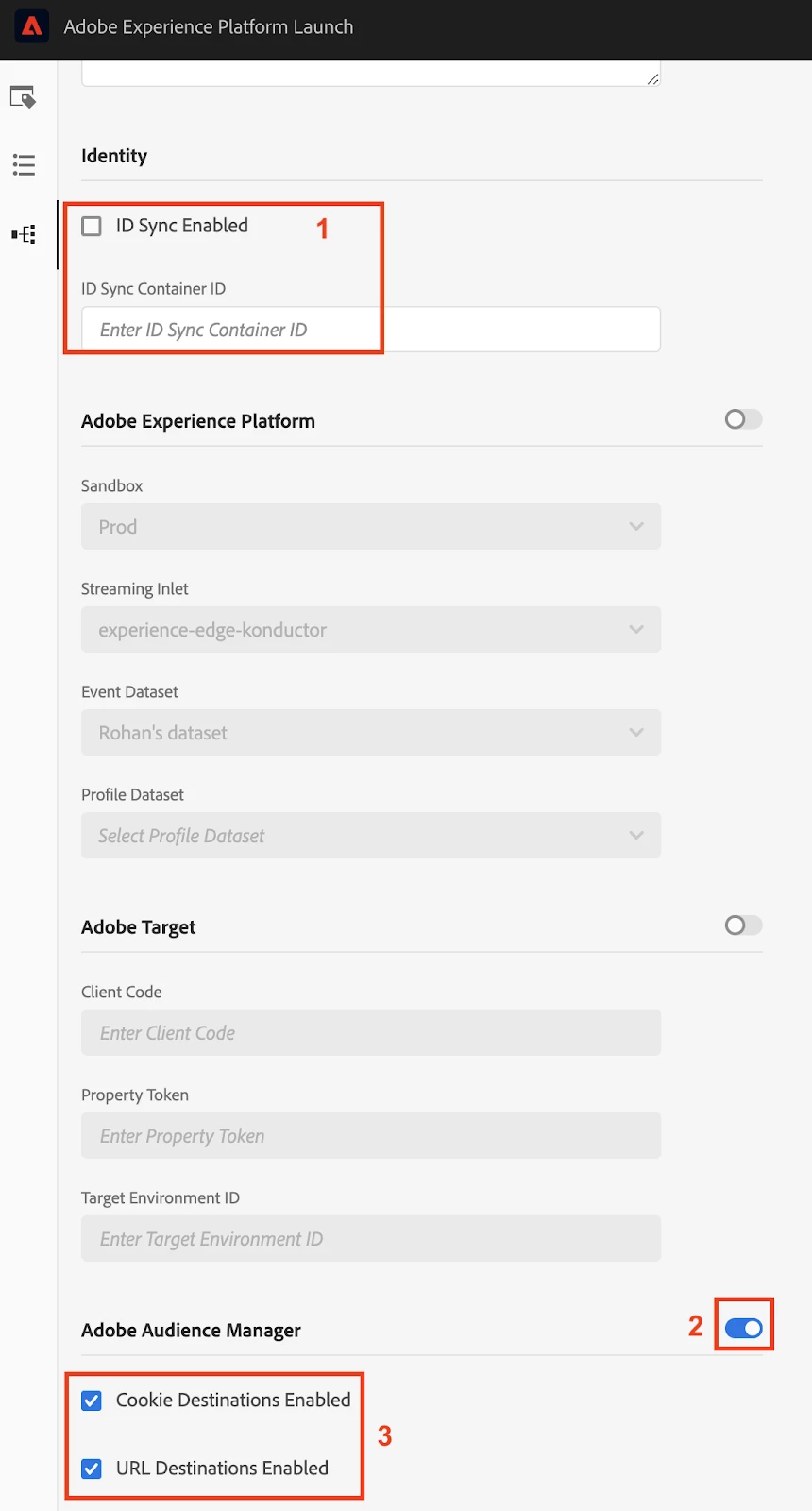 - “ID Sync Enabled” checkbox allows us to activate third party ID syncs tied to an Audience Manager container ID.