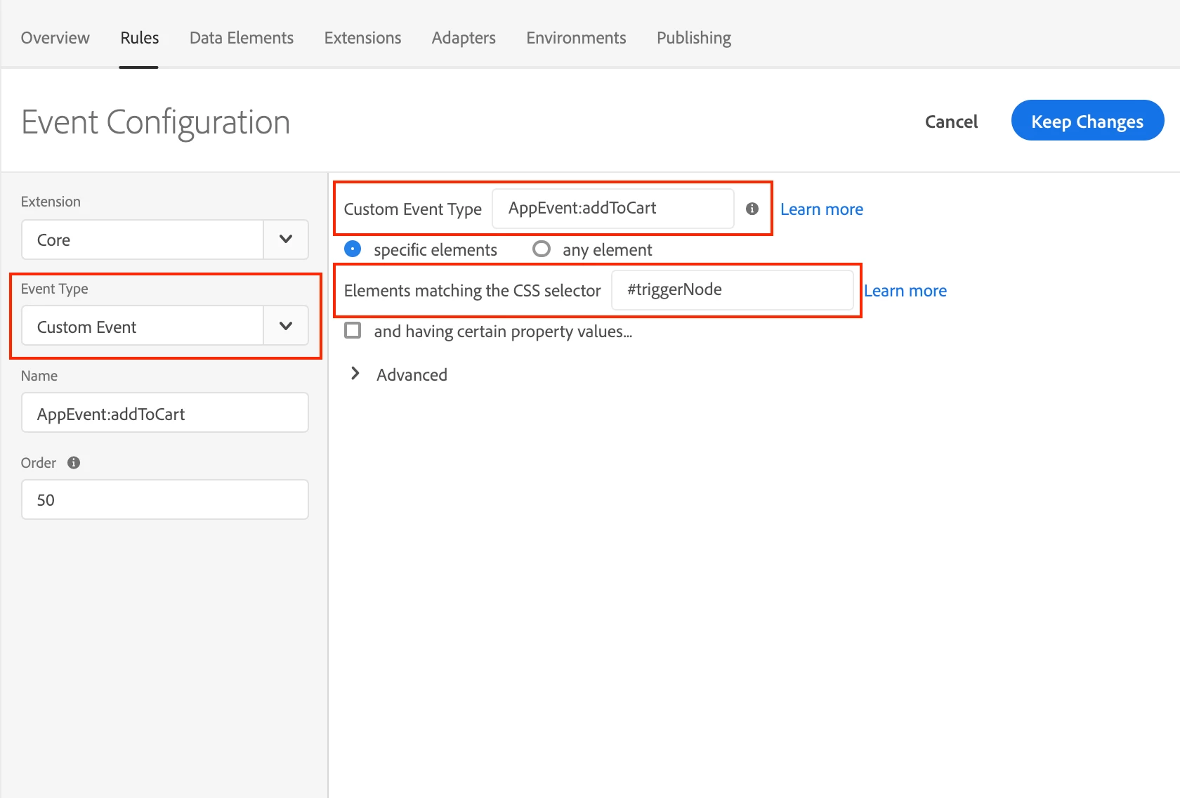 iii. Note that we have selected specific element` and set `Elements matching the CSS selector` to `#triggerNode` (matching the value from the Data Layer Manager configuration setting in Step 1.