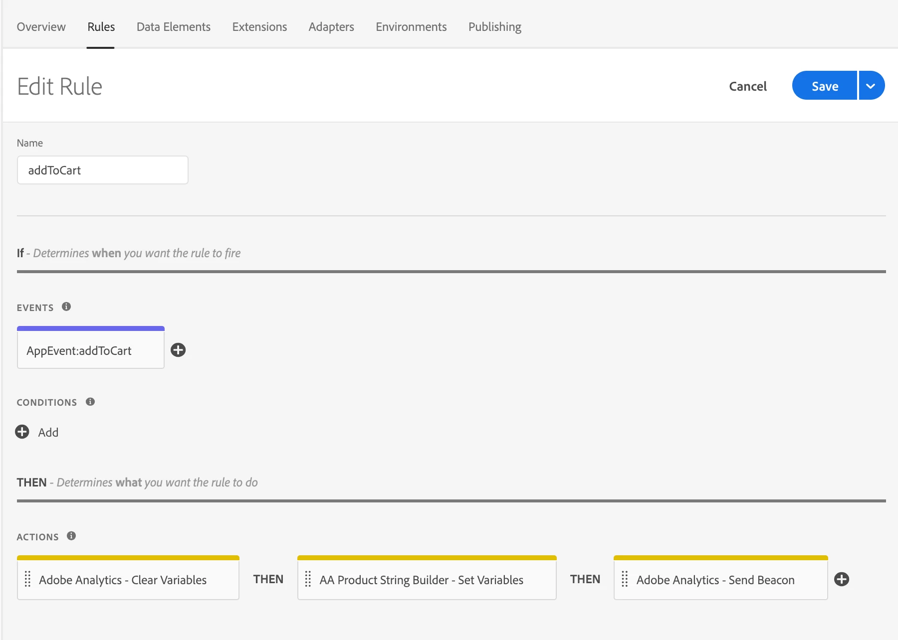 We will be adding three actions to this rule (two from the Adobe Analytics extension, and one from the AA Product String Builder extension).  When complete, the rule will look like this: