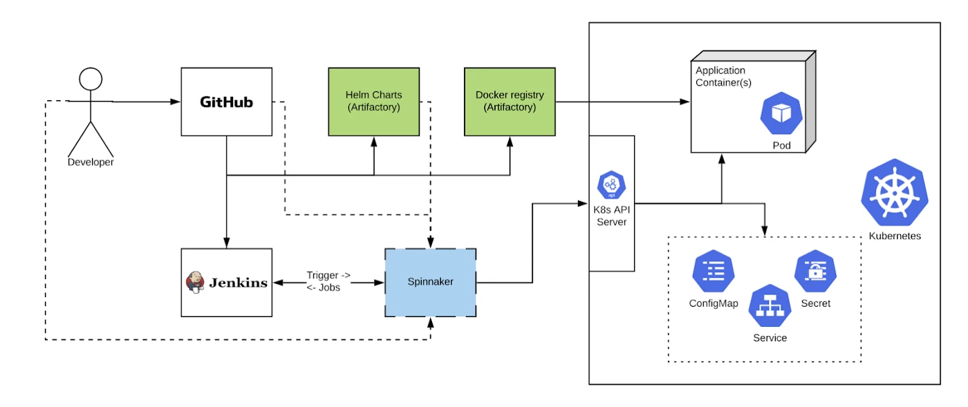 Figure 2 shows a typical workflow. A developer raises a PR, which triggers a Jenkins job that does a build, including unit and basic integration tests. If successful and merged, a commit to certain branch(es) triggers another Jenkins job. This triggers a Spinnaker pipeline. Spinnaker supports baking Helm chart artifacts pulled from Artifactory, along with any values stored in git, resulting in the Kubernetes manifest.