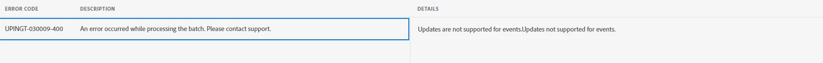 The error notice "Updates are not supported for events." generally indicates you're attempting to edit or alter events that have already been ingested into Adobe Experience Platform (AEP). Once an event has been ingested, it cannot be changed or updated; instead, send a new event to AEP with the updated information.