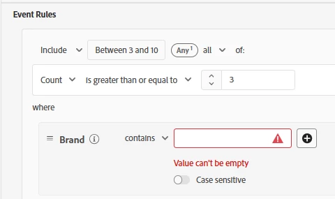 I want to build a segment where a user has seen an event such as a page view (in this example "brand") more than 3 times but less than 10 times.
