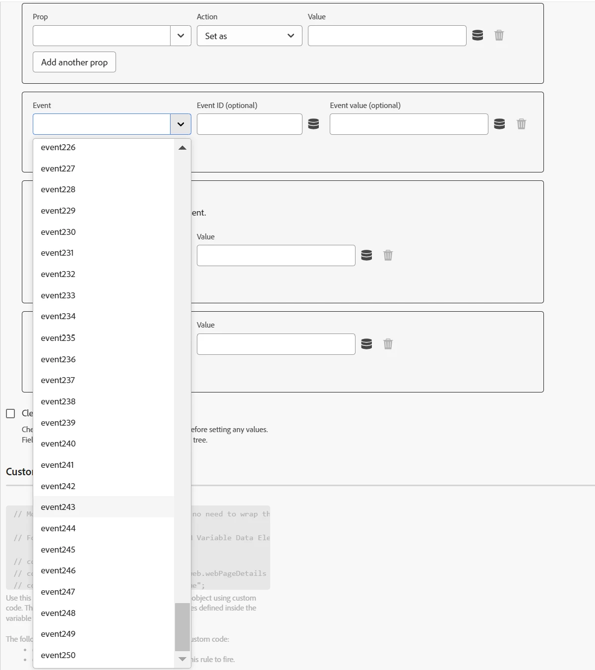 when I am configuring the Update Variable command for the Data type Variable (instead of XDM), there seems to be a problem with the available events. The list only shows up to 250 events, though we have 1000 available. Additionally, it's not possible to manually fill in the value because a "not found" error appears. I know I can possibly set the events in the custom code or by providing a JSON, but that kind of defeats the purpose of the UI fields.