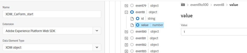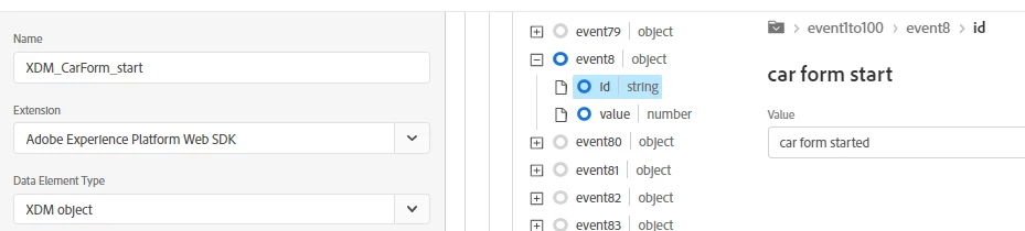 1) created an XDM data element to map event 8 to form start id name and value