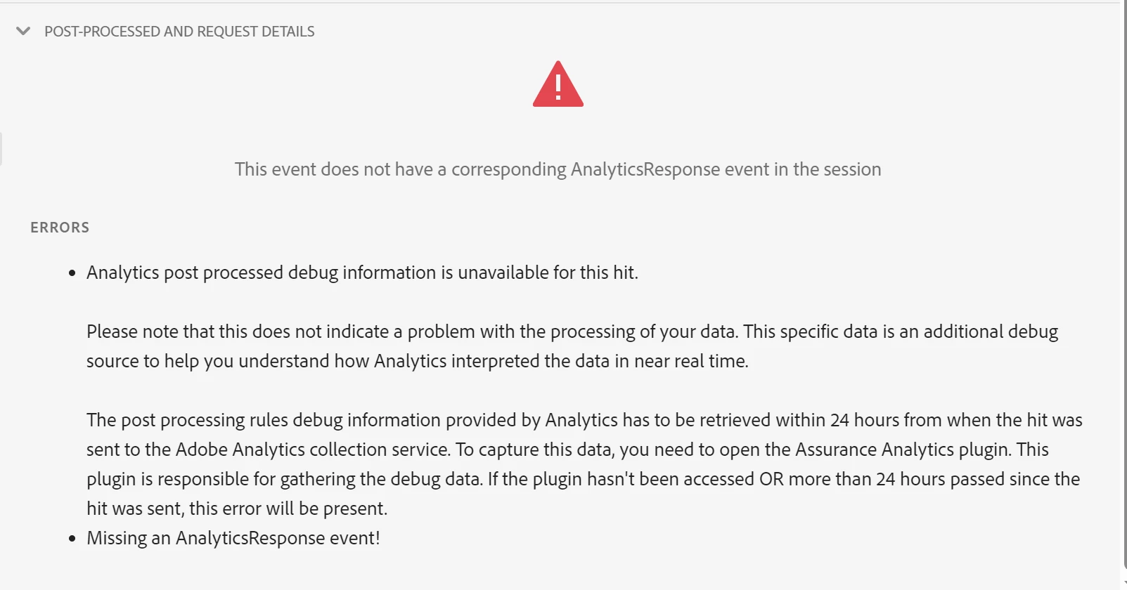 While testing a mobile app this week, I noticed some errors showing up in Assurance. I can see the network requests when loading/switching screens, but I never see the post-processed hits coming in to verify the processing rules are working. Based on the more detailed error message, this doesn't mean that data collection isn't happening. I can confirm that data is making its way into the report suite, but I really need to see the post-processed hits in Assurance to verify things are being mapped correctly and the data is coming through as expected