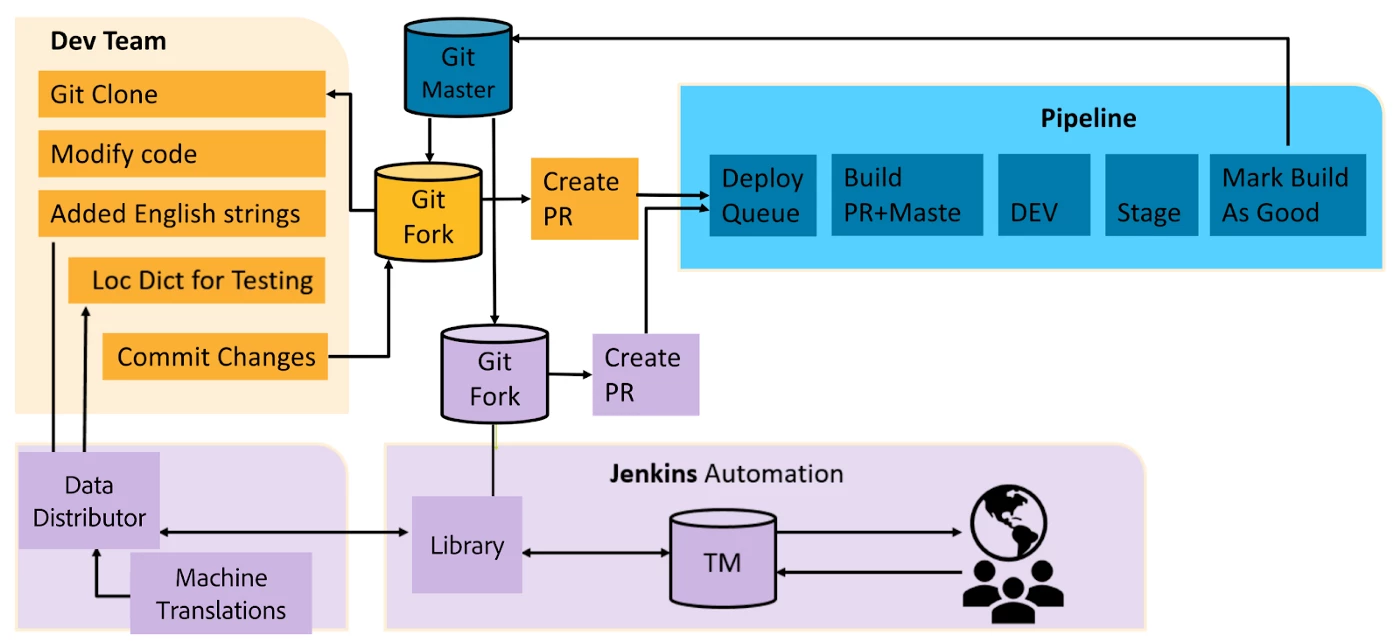 To keep up with continuous global content requirements, fast-moving businesses can rethink their approach for updating and translating content. Continuous localization optimizes the process of Continuous Integration / Continuous Deployment (CI/CD) by including machine-translated strings for testing. This helps with local development quality checks, particularly for common I18N bugs.