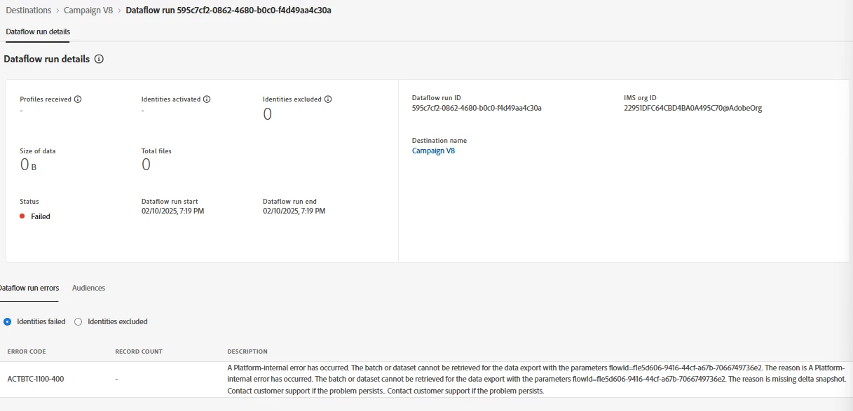 I want to activate audience from AEP to Campaign V8. What does this error means?