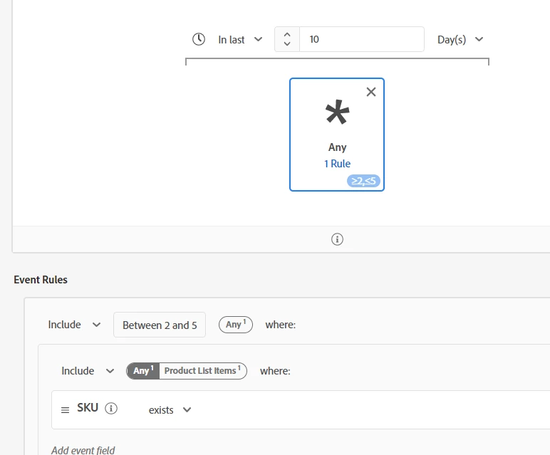 I am trying to create a segment with audience of count of Unique purchases (SKU's) between 2 and 5 in the last 10 days.