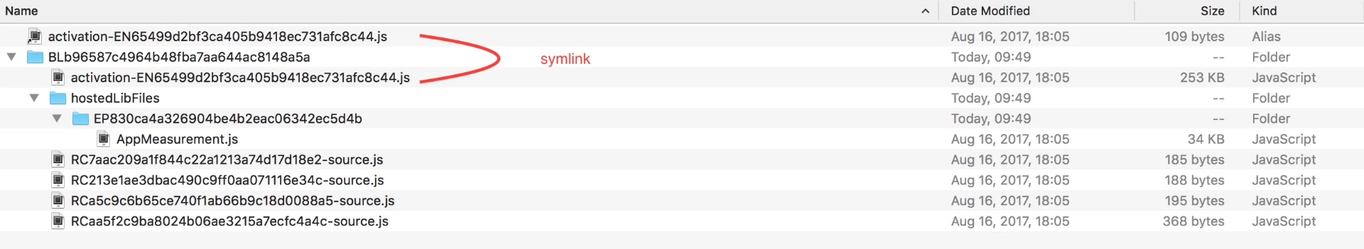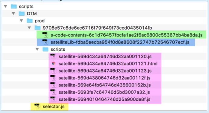 All the files will be inside a build folder containing the build id number (BLxxxxxx). On the same level with the build folder, there will be a symlink pointing to the Launch library that is inside the build folder. All the custom code files will be inside the build folder. The hosted library files will also be inside the folder (like AppMeasurement.js for example).