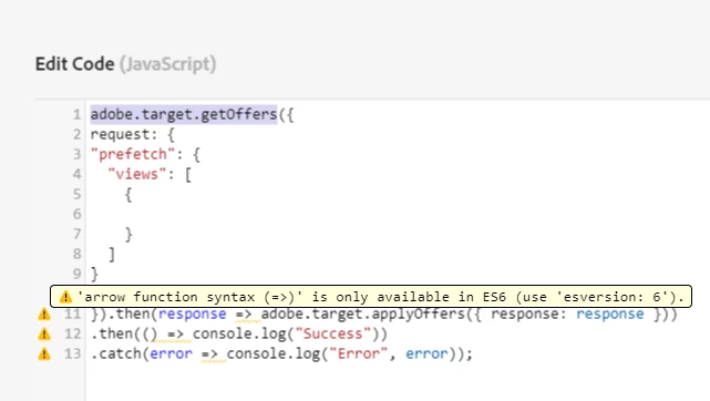 I've been trying for several days now to get the at.js 2.0 running for SPAs, until I finally found the documentation. Now that I got it to work using the adobe.target.getOffers() & adobe.target.applyOffers() function I cannot insert the code over Launch because the editor shows an error and the minifying of custom code fails. See screenshots below. Any ideas how this will work out?