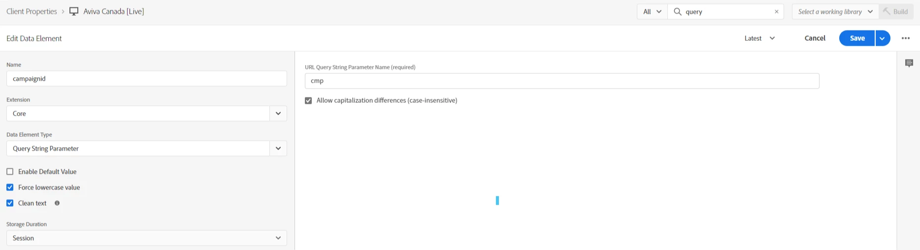 In Launch, I have a data element %campaignid% that is set to capture value from cmp query string parameter.
