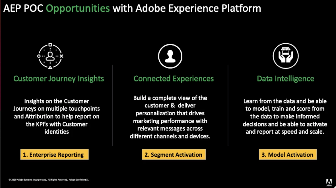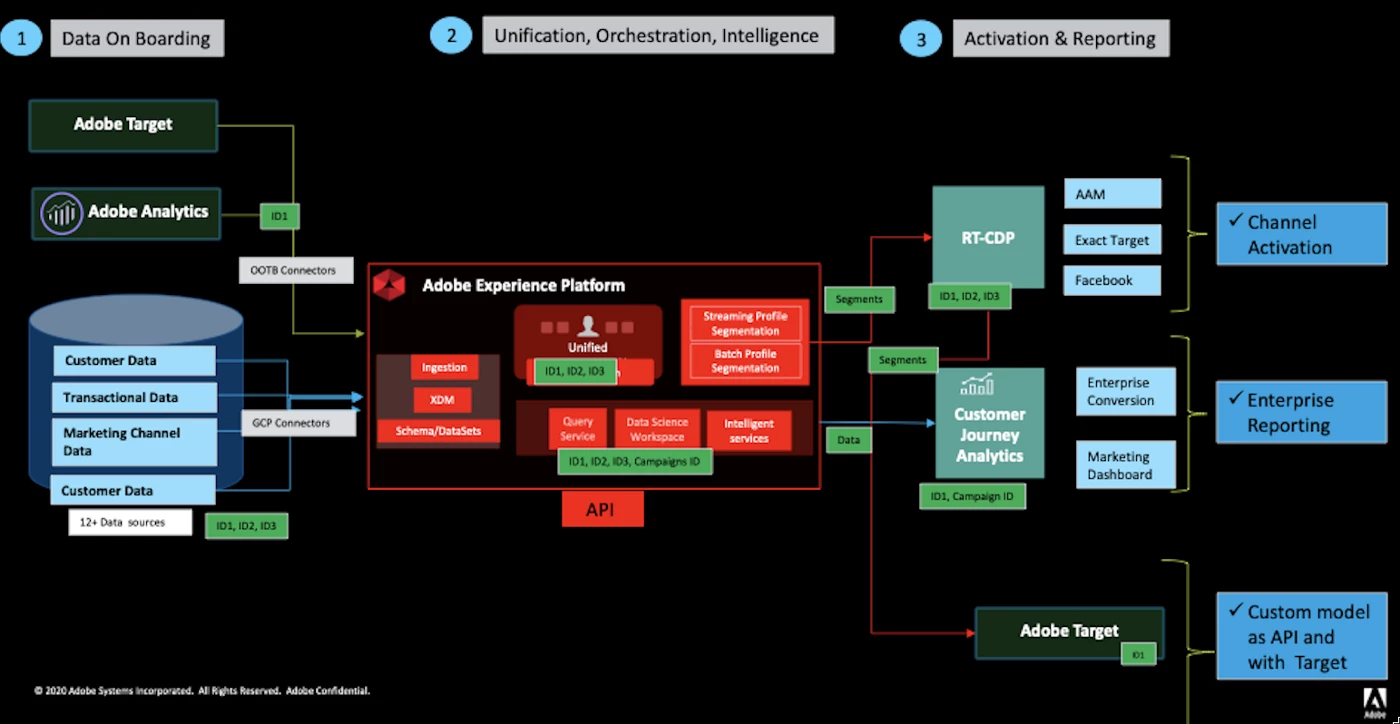 At the core, the architecture demonstrated the onboarding of data into Adobe Experience Platform via Streaming, batch connectors, and then augmenting the data into Adobe Experience Platform by building profiles, segments and orchestrating it for Activation and reporting.