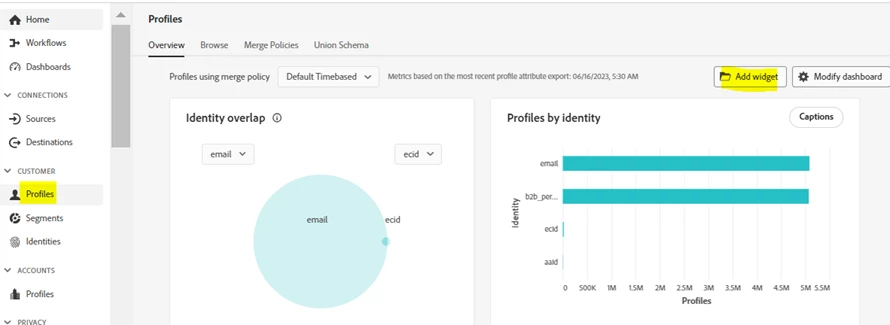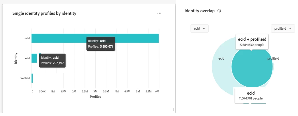 - As a starting point, these graphs can provide clues on which namespace the profile count is coming from (e.g., cookie-based identity namespace like ECID/AAID or CRM (profileID) from known users). However, the complete metrics of Identity Overlap are best obtained via API as discussed in the next step.
