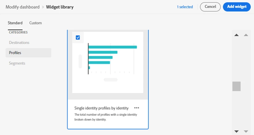 - Add the widget “Single Identity Profiles by Identity” to Profile Dashboard