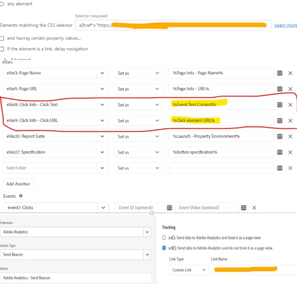 the person who did the starting setup in some of our sites created specific rules to track some button clicks (using CSS) - including the evars (page name, page URL, report suit, and click text (%Event Text Content%) and in the data element part created one called "Click Info - Click Text" where I believe collects the text of the button.