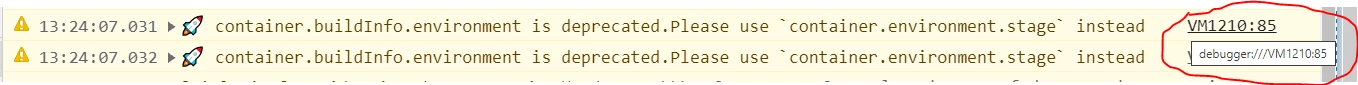 If you mouseover the "VM###.##" link in the console log entry, it might display something like, "debugger:///VM###.##". If you click the link, it will take you to the offending code that the debugger injects into the page. Disable the debugger and see if the warnings cease.