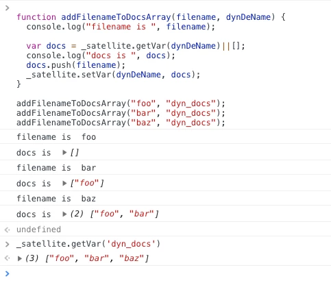 I have a page with a list of documents and a checkbox next to each. A user can select what they want, then press a button at the bottom which basically shares these documents. What I'm trying to do in Launch is each time the user clicks a checkbox, it adds (or removes) the doc item from the array. I'm creating the array in the rule but checking for its existence. So the rule fires, I got the document name and I can push it into the array. The problem is the array keeps getting created despite checking for it. So either my js is wrong or the array gets removed at the end of the event.