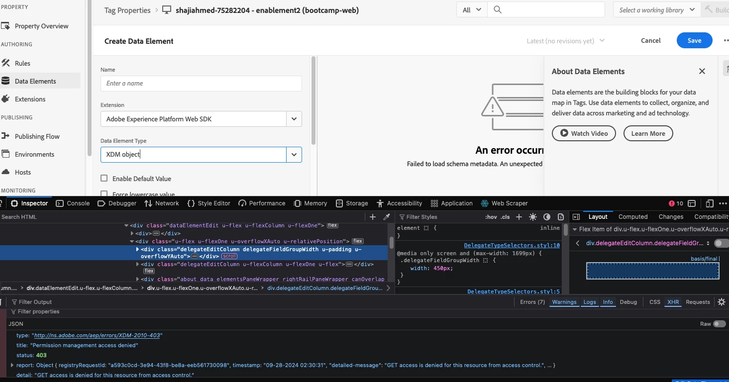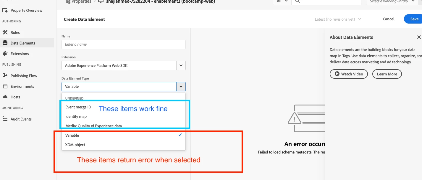 In the section Create Variable data elements for XDM and data objects when I select variable at step 4, I get error message