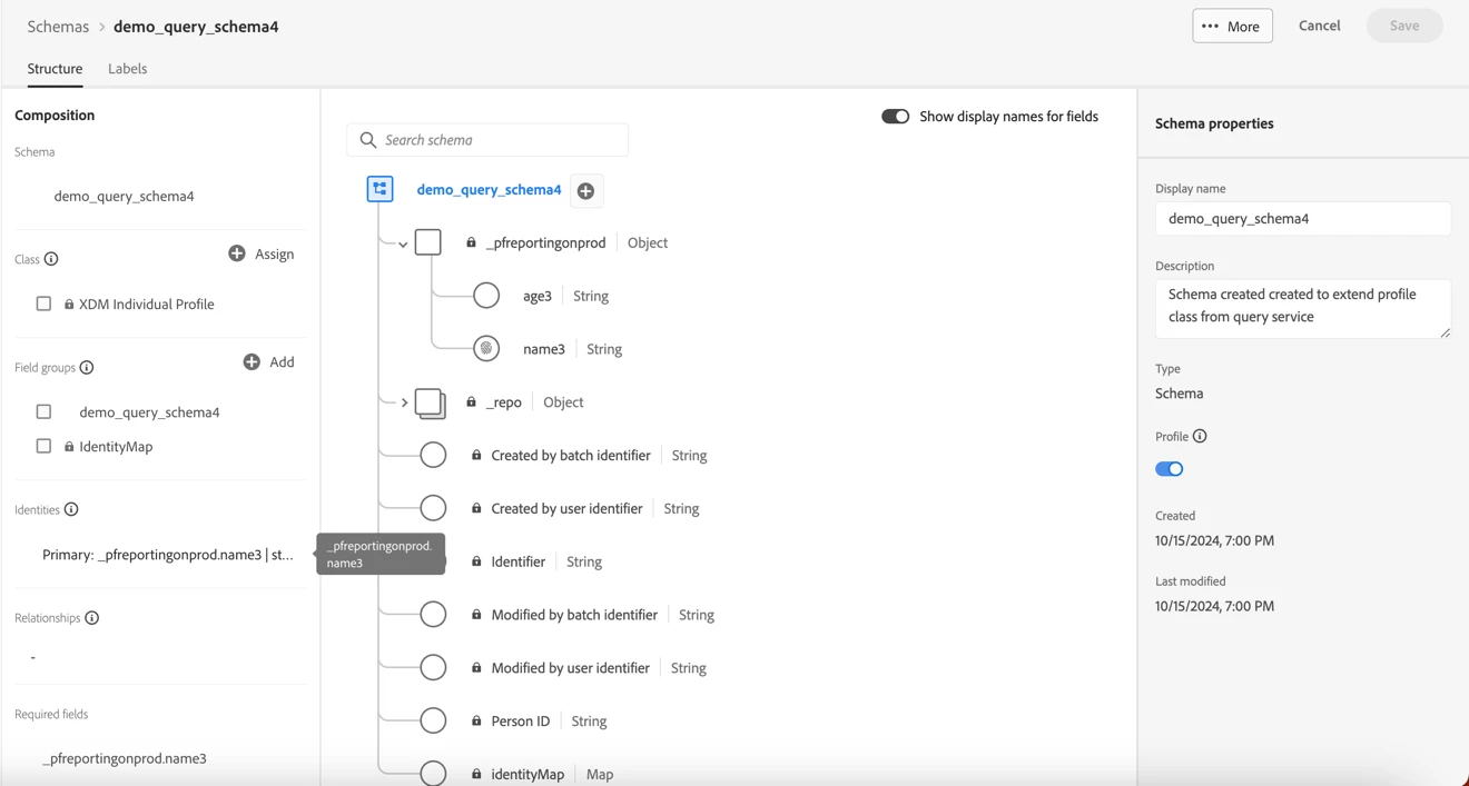 Create TableSchema demo_query_schema4 AS (name3 text PRIMARY IDENTITY NAMESPACE 'IDFA', age3 text, identityMap fieldgroup) with (label='PROFILE');