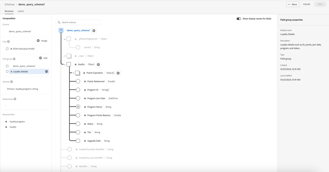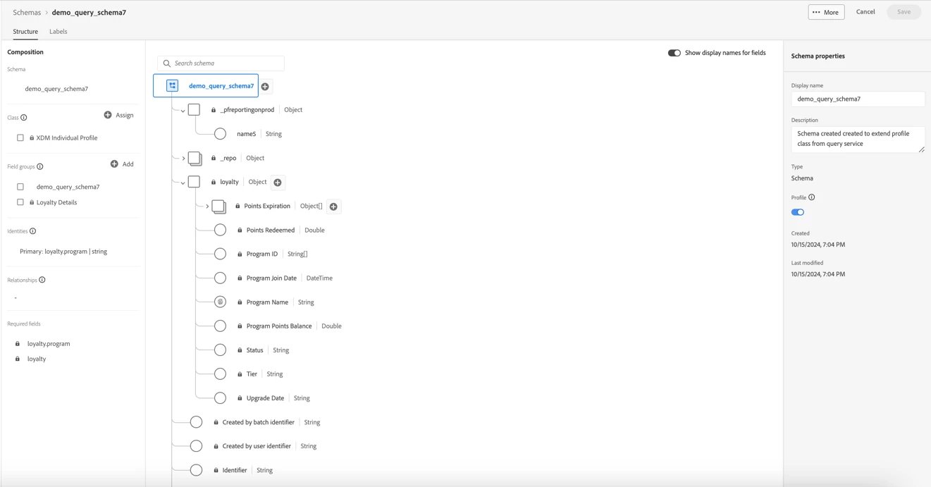 Create TableSchema demo_query_schema7 AS (name5 text, `Loyalty Details` FIELDGROUP loyalty.program PRIMARY IDENTITY NAMESPACE 'IDFA' ) with (label='PROFILE');