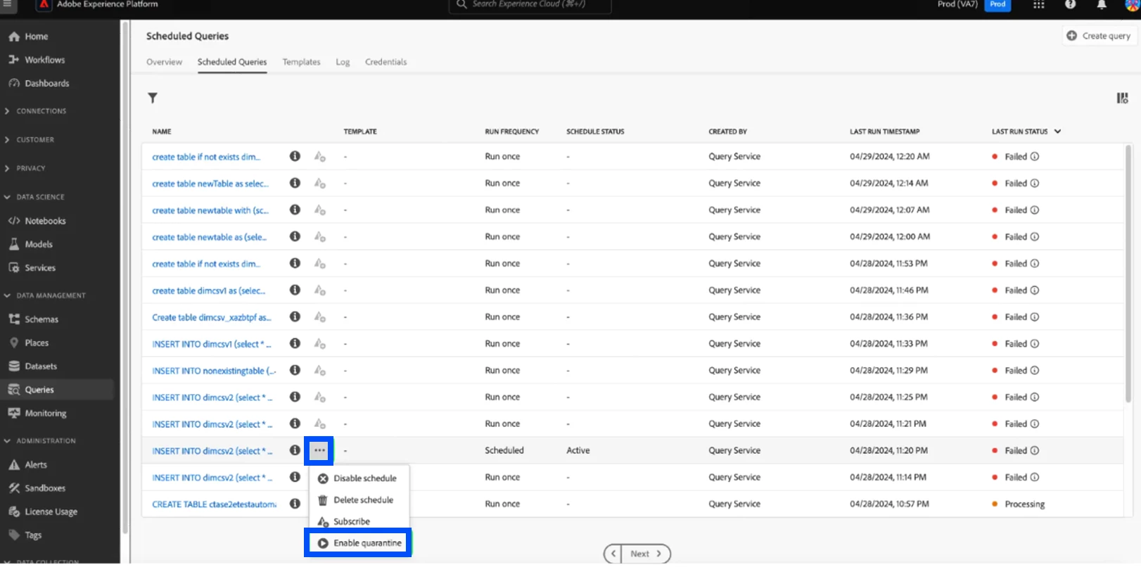 Query Quarantine is now available to all Data Distiller users. By implementing this feature, organizations can safeguard system resources, prevent potential disruptions of derived datasets, and ensure more efficient data processing across Adobe Experience Platform applications.