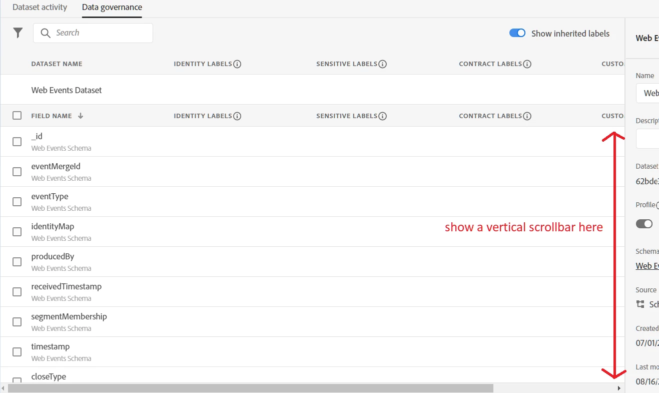 Dataset > Data governance: show vertical scrollbar in table