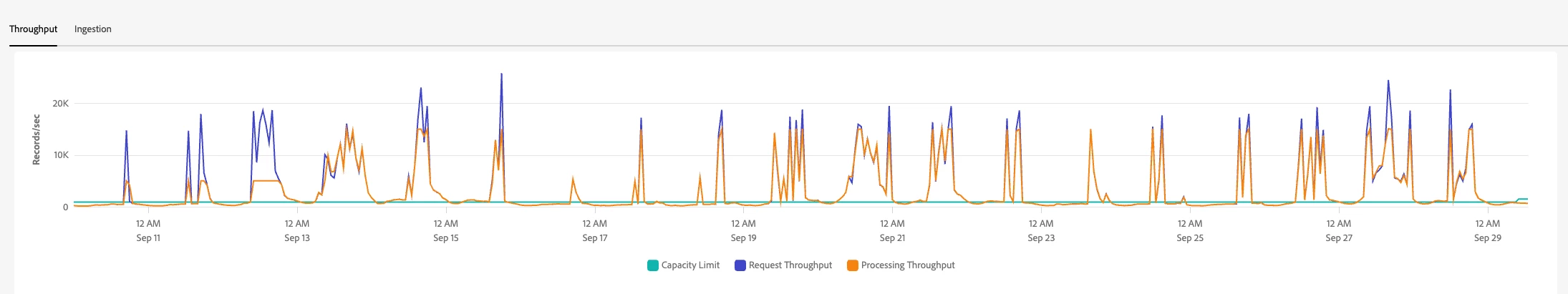 We have a scenario of data(events) ingestion into RTCDP with 20k requests per second, However the processing Throughput is 1500 req/sec as per standard allocation from Adobe platform which can increase based on availability of platform resources. In our case, it's gone up to 15K. Thanks to Adobe's robust allocation algorithms. However, we have seen significant drop(to 1500) sometimes (Attached snapshot for reference). Just wanted to know if anyone experienced this issue and have a solution.