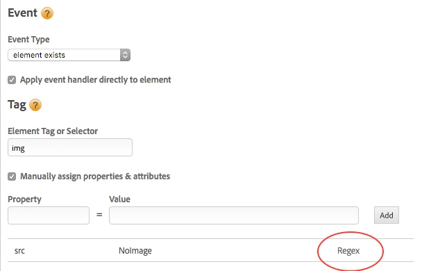 Hello. I've got an Element exists Event-based rule for detecting an img tag which contains a placeholder image (essentially a no-image image to tell me how often customers are looking at products without images).