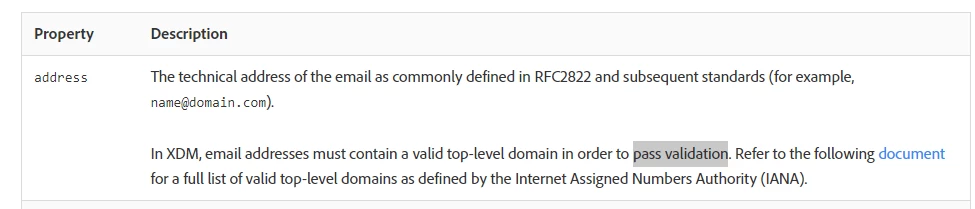 As per Adobe Documentation here, data.iana.org/TLD/tlds-alpha-by-domain.txt, Adobe follows for pattern matching for an email value however when I am inserting a random email address as test@test.com as random testing, it got inserted, however as per my understanding and below screenshot it should fail