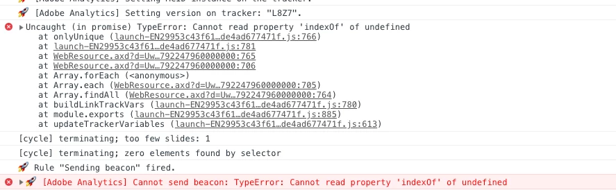 Error : [Adobe Analytics] Cannot send beacon: TypeError: Cannot read property 'indexOf' of undefined