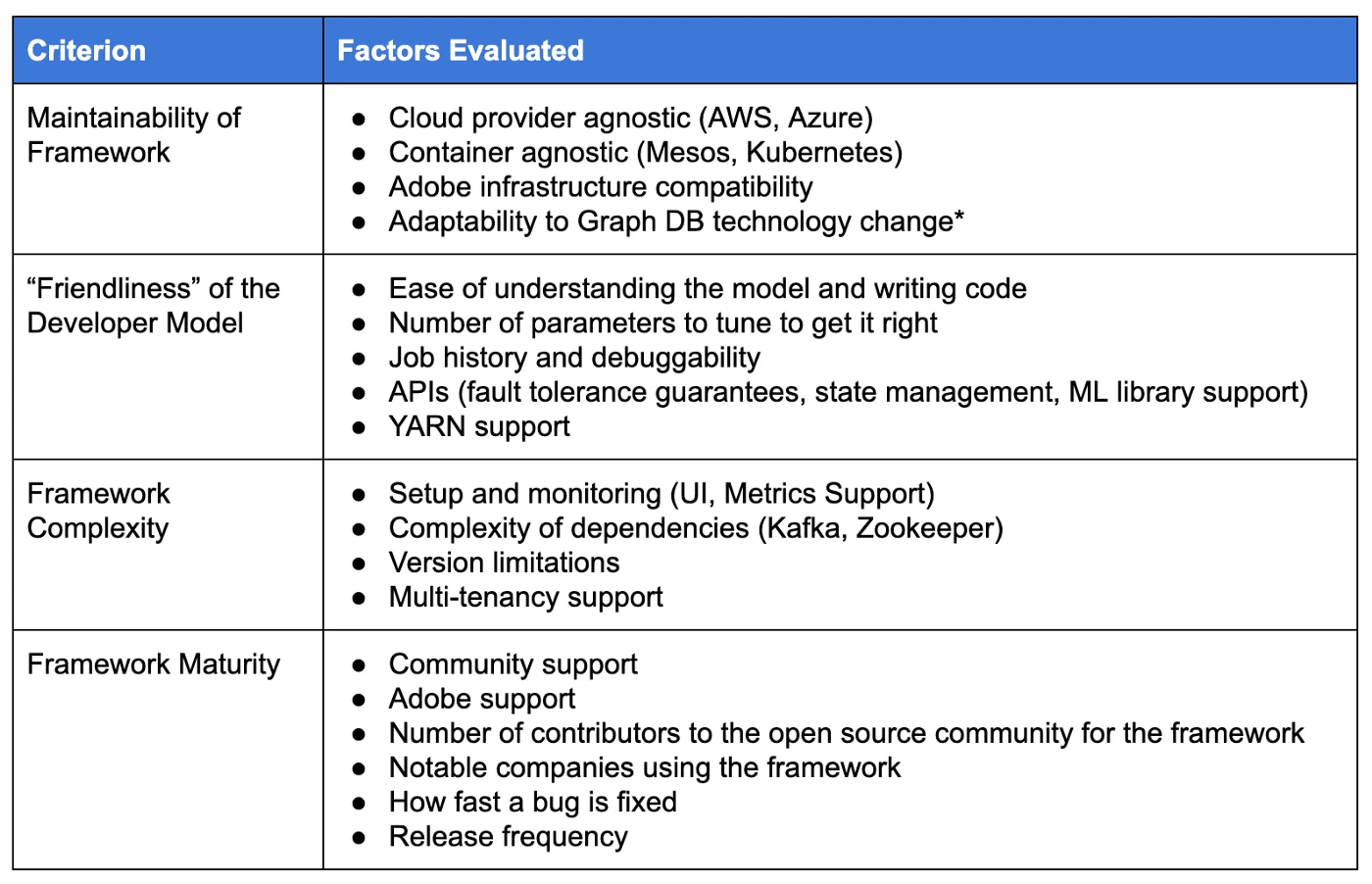 Our evaluation included both qualitative and quantitative criteria. While quantitative benchmarking is critical in evaluating a streaming framework, the additional, more qualitative measures included in the list below were also important to consider in choosing a streaming framework to support the real-time needs of Adobe Experience Platform customers using Adobe Experience Cloud: