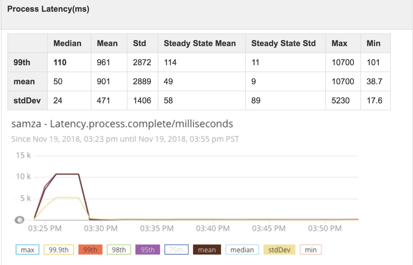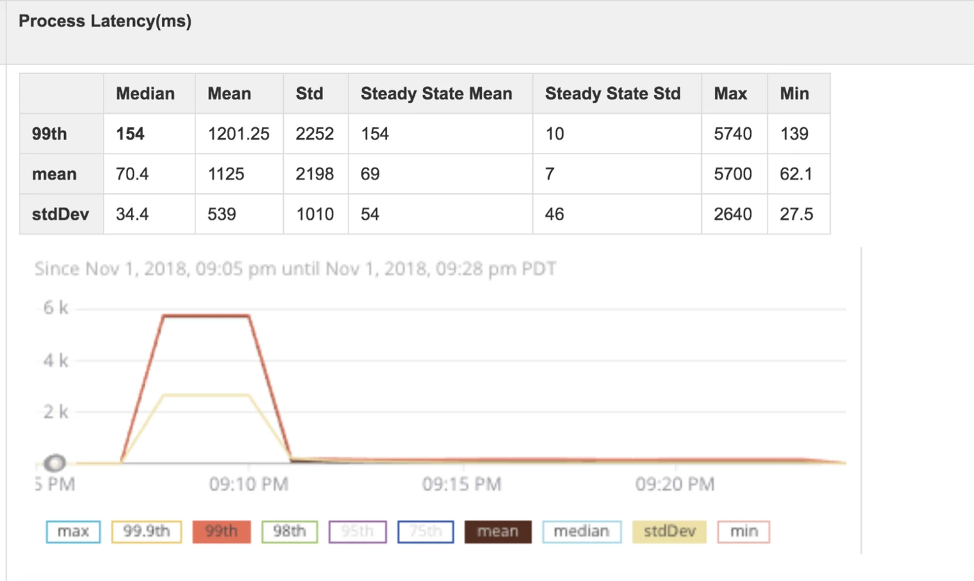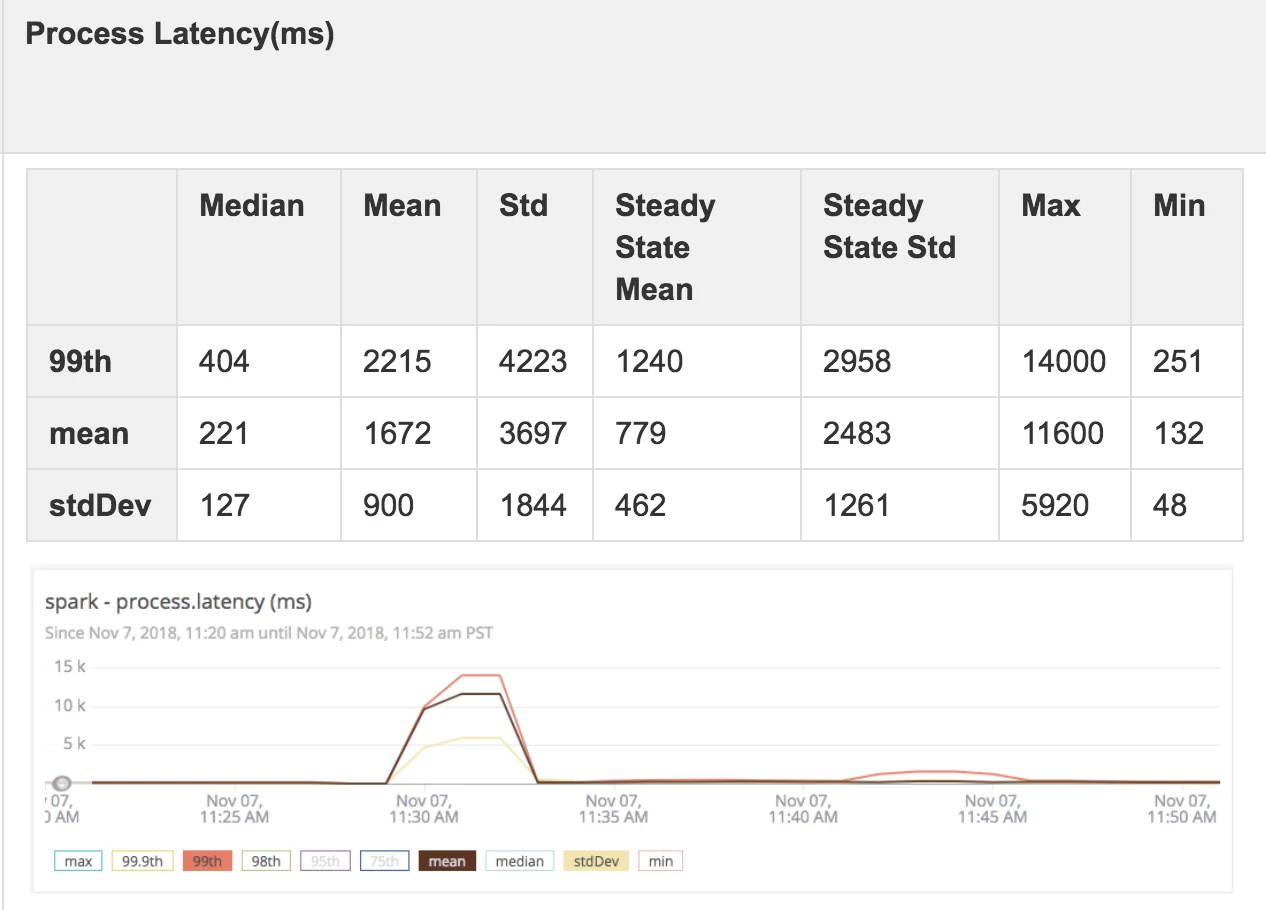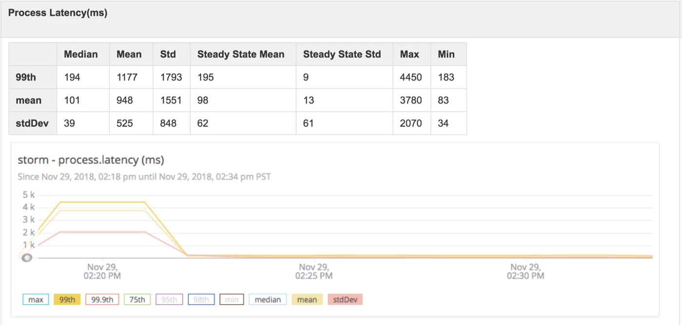 - Latency: The 99th process latency was below 200 milliseconds for most of our event runs, and the 99th process latency standard was less than 30 milliseconds. Both of these results were obtained at a confidence level of greater than 99%.