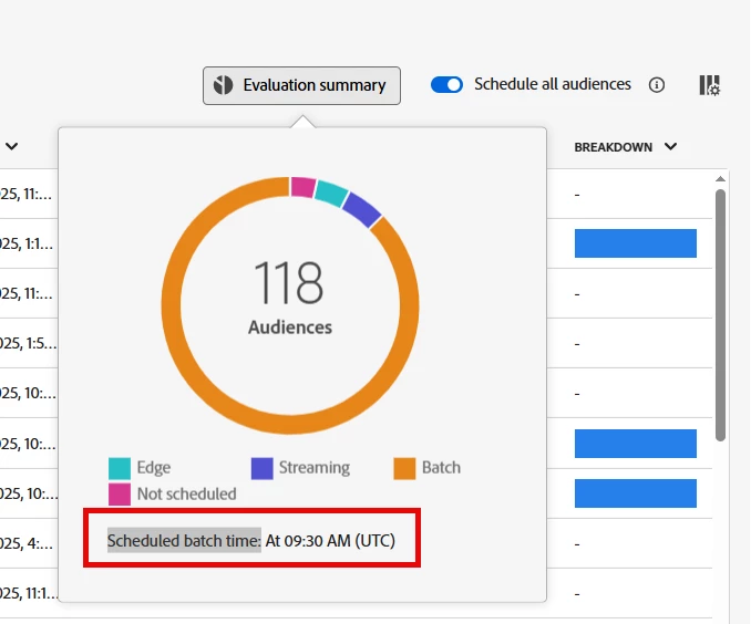 After the daylight saving change, our Audience Evaluation scheduled batch time is running one hour earlier than expected, which is causing mismatches in Audience results. We need to adjust the scheduled batch time for the Evaluation Summary.