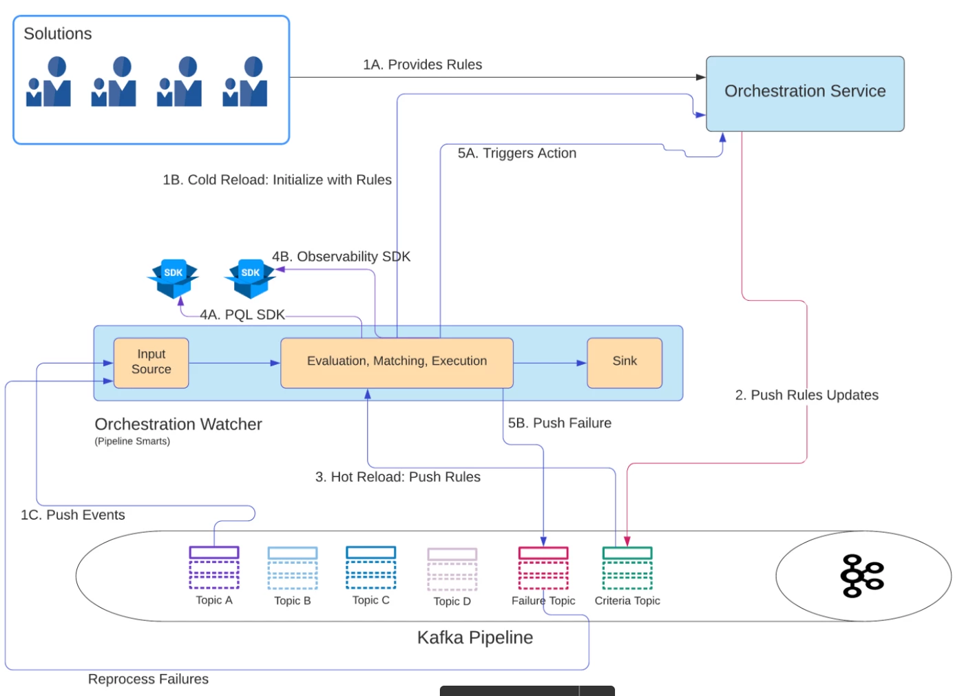 - 4A. PQL SDK — Orchestration Watcher interacting with PQL SDK for matching rules against events coming from source topics.