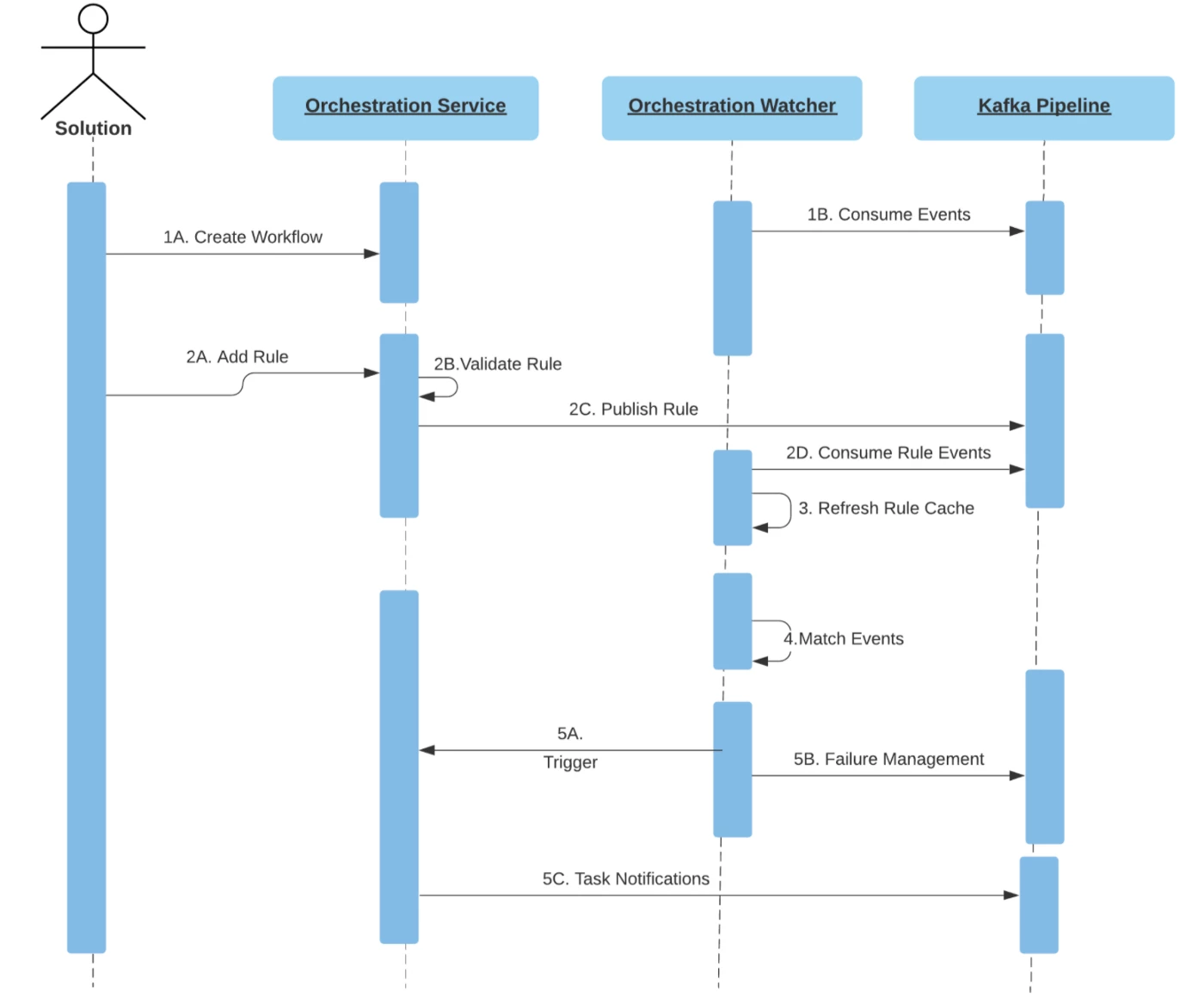 - 5A. Trigger — Post Matching event, Workflow triggering action is sent to Orchestration Service.