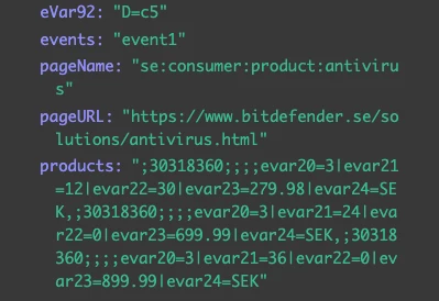 { "__adobe":{ "analytics": { "eVar1": "Raven", } } }