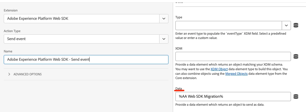 dataObject = { "__adobe": {"analytics": {"evar1": "some value"}}, "semanticData": {"dataPoint1": "some value"} } alloy("sendEvent", { "data": dataObject });