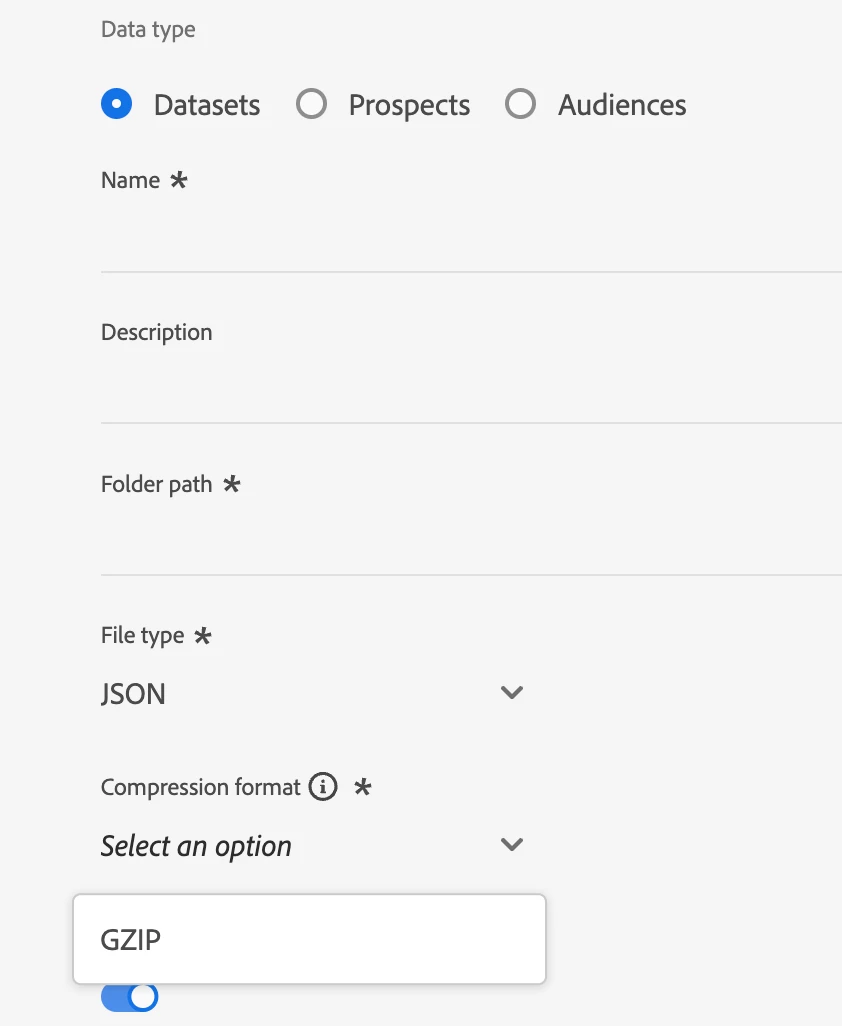 When setting up a destination to export a dataset to Data Landing Zone as a JSON file, it appears that there is no longer a 'None' option in the compression dropdown (see attached screenshot).