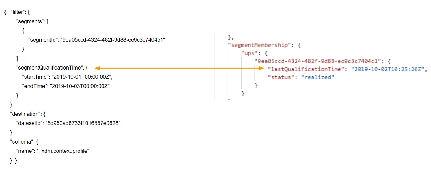 In this export job example, we filter the segmentQualificationTime by start time and end time. This will return only those profiles which entered the segment between that timeframe.