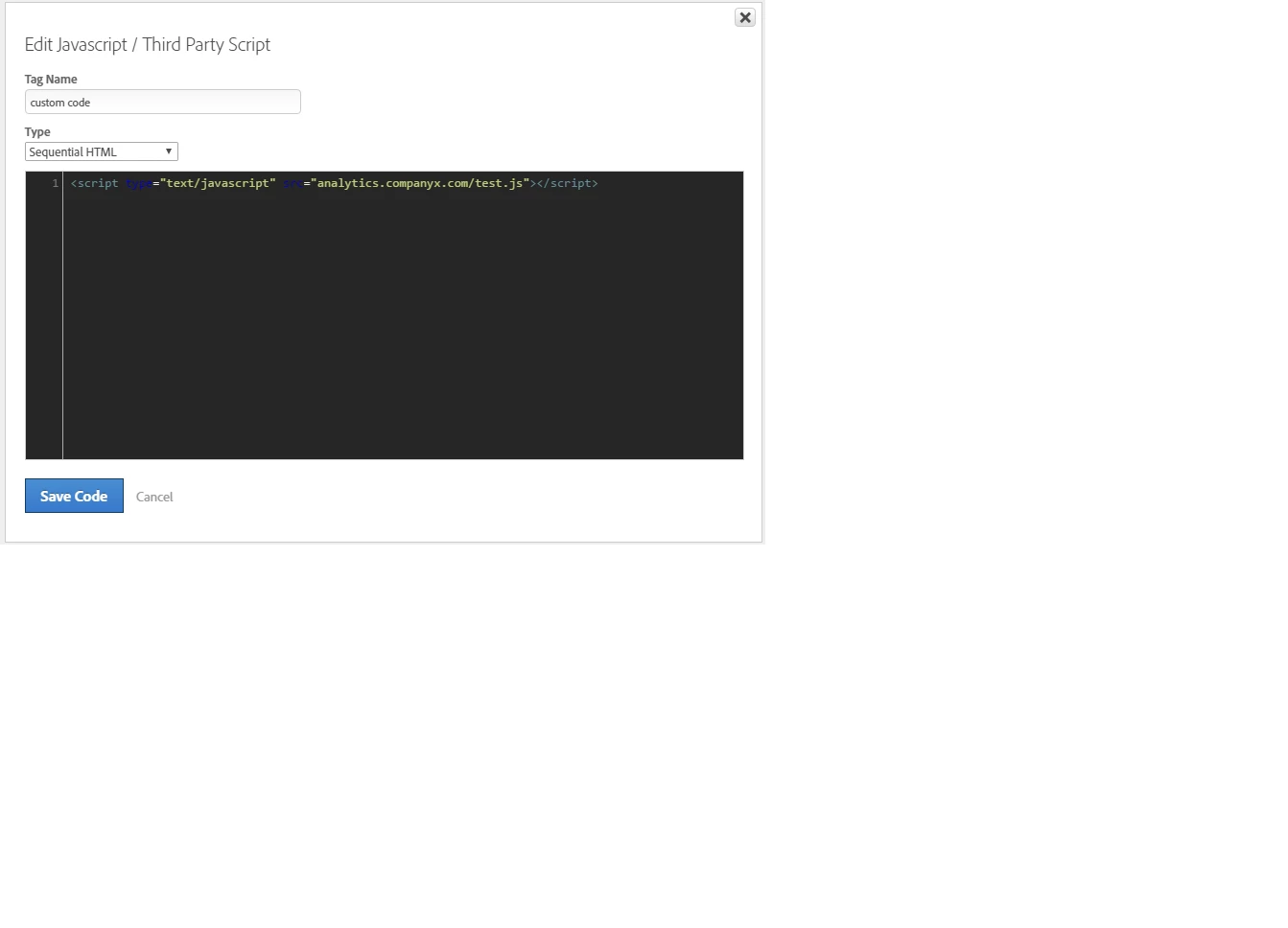 var script = document.createElement('script'); script.src = 'http://example.com/js.js'; // your script URL script.onload = function () { //this is only necessary if you need to call something directly after the script loads }; document.head.appendChild(script); // adds external script to pageAs long as your Event based rule will fire after this is loaded, you should be good to go.
