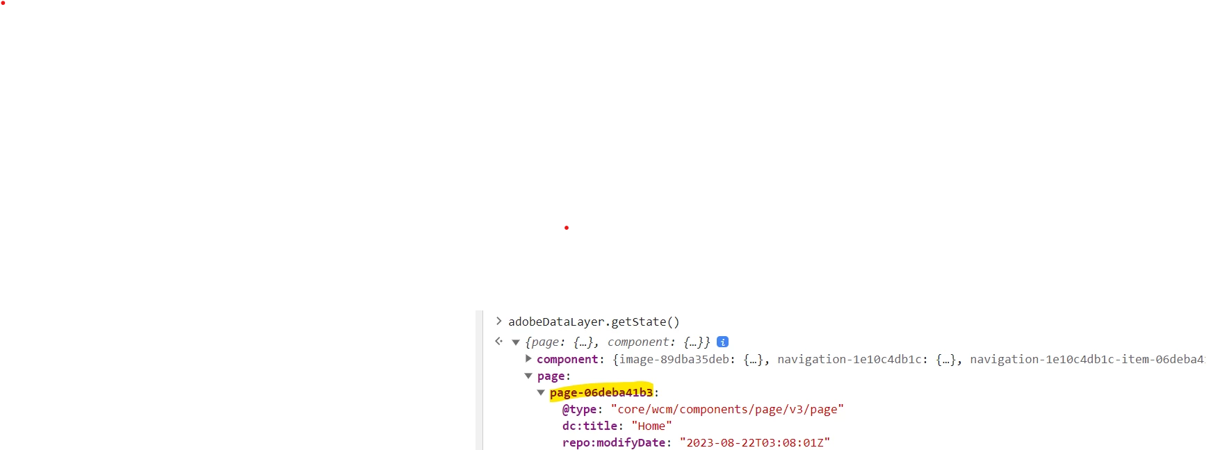 In cmp:show, the below highlighted value is changing dynamically and hence, I am unable to use ACDL extension with adobeDataLayer.getState().page['page-06deba41b3']['dc:title']