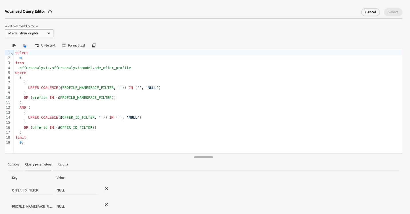 Feel free to explore the dataset(s) using the query editor to arrive at the data you need for your analysis. For this blog, I am focusing on retrieving the profile identities and offer placement details from the system dataset, and the SQL I used is provided below. Please note that the table name “ode_decisionevents_emea_uk_sc_decisioning” is specific to the sandbox dataset name from the previous step. You will have to find the table specific to your sandbox and replace it in the SQL.