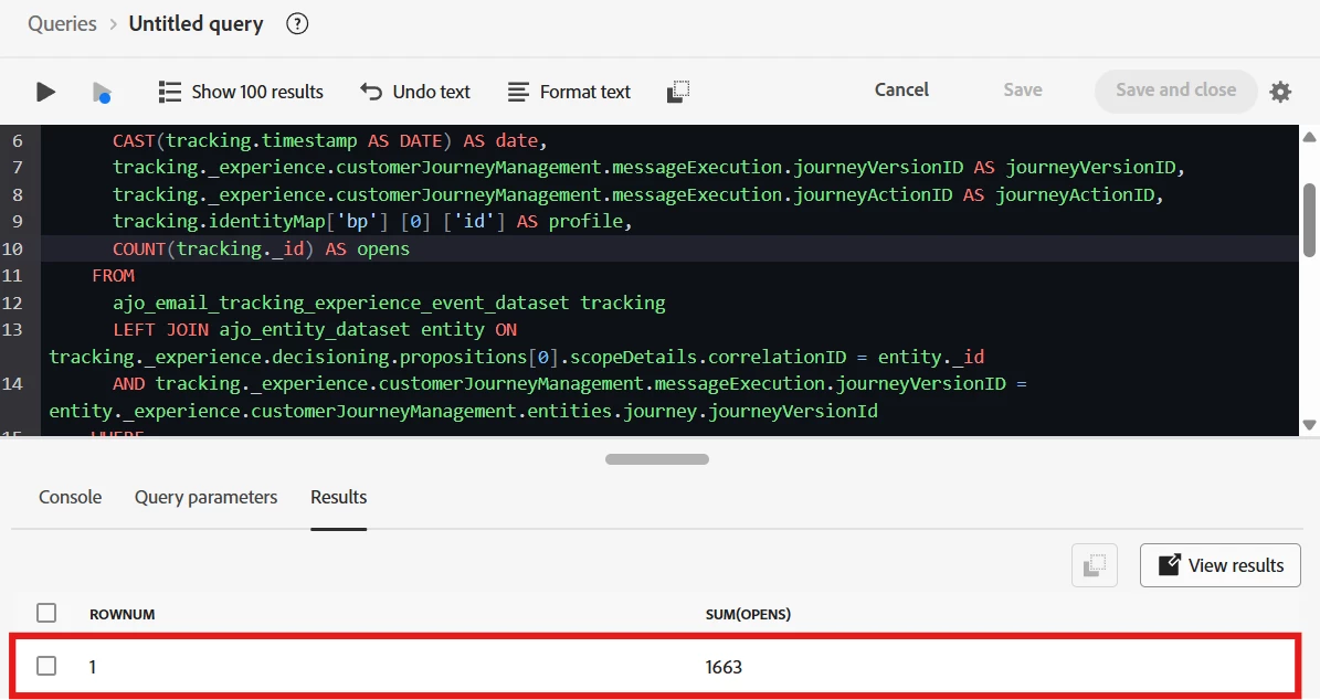 I have been trying to get the metrics that are obtained by Journeys reporting in Journey Optimizer, such as number of messages sent per messaging node, number of messages bounced per messaging node, etc, however, I get values that, in most cases, are close to what the reporting shows, but not exact. Next SQL statements tries to get number of messages opens per date, per Journey Version ID, per Journey Action ID, per profile (BP):