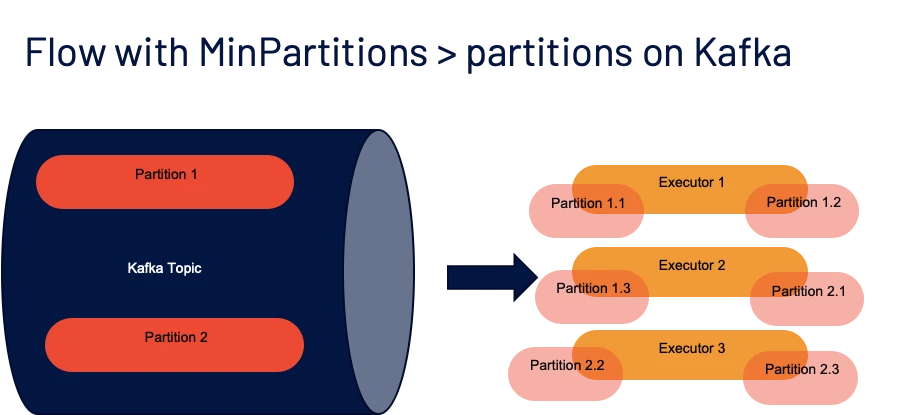 ** If we set this option to a value greater than our number of topicPartitions, Spark will map the input Kafka partitions to subpartitions on the Executor side. I.e if you have 6 partitions on your Kafka Topic, but you set minPartitions to 12, roughly, each input partition might be mapped to 2 subpartitions on the Spark side.