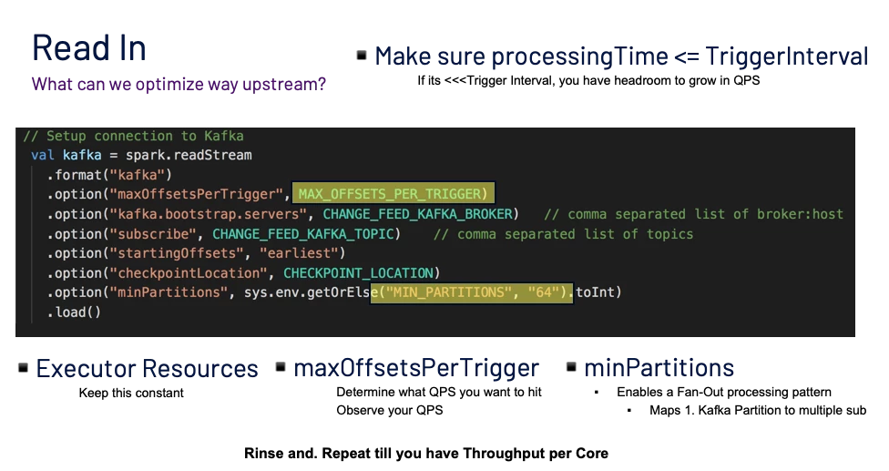 Let’s take a look at some parameters that we feed into the Kafka spark source that we tuned and led to a throughput increase: