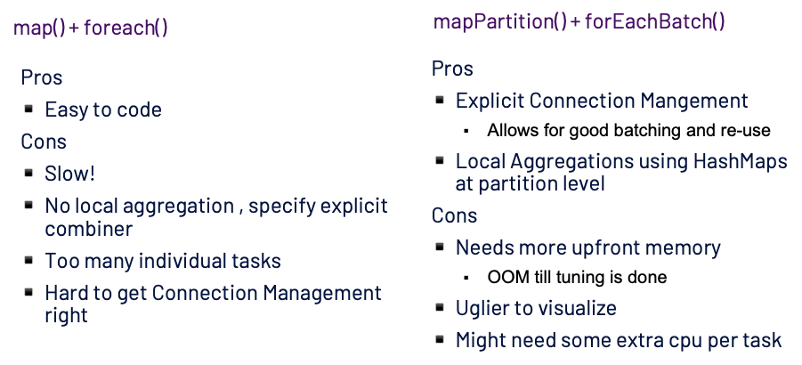 When we micro-batch, we are presented with two options to express our business logic, using a map + foreach or a mapPartitions partition. There is no right or wrong way, though understanding the trade-offs as presented below can save you a good amount of time instead of sitting with a profiler tool.