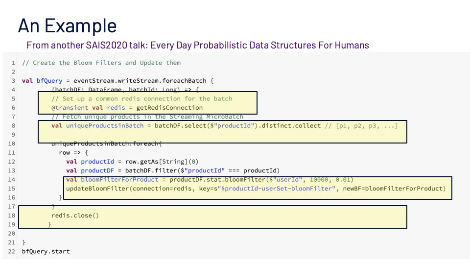 Figure 11 shows an example use of foreachBatch. This example shows the use of a top-level Redis Connection redis to be shared by the task components. The calculation of the uniqueProductInBatch attribute shows pre-processing and aggregating data locally at the task level for a partition. We see an example of utilizing the common top-level connection in the usage of the updateBloomFilter() function. An explicit teardown of top-level- shared connection is shown at the end of the foreachBatch with a redis.close().