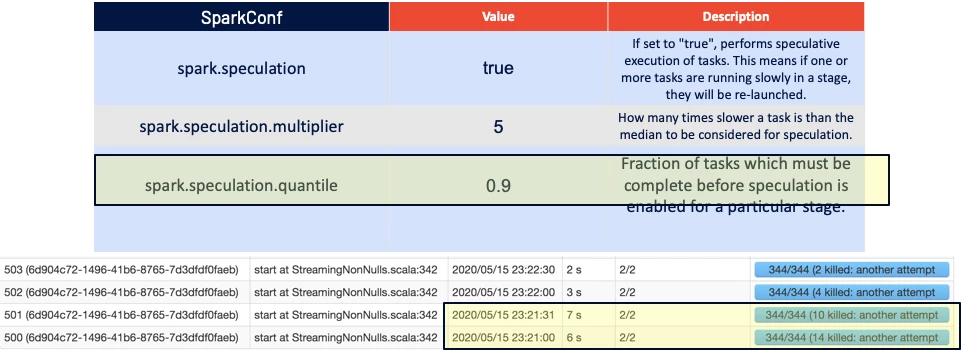 spark.speculation.multiplierandspark.speculation.quantiilegive granular control on the details of the speculation.